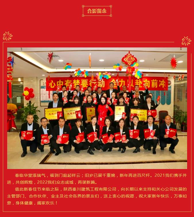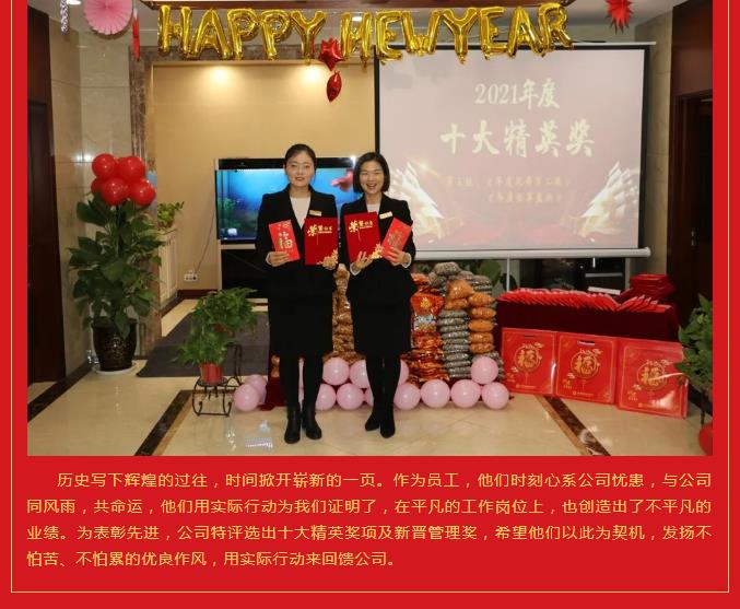 2021年終表彰暨福利發放大會 歲月不居,時節如流。70多年的光輝歷程和與春秋歲月,書寫了華夏民族的勤勞勇敢,留下了中國人的敬業拼搏。15年來秦川人秉承敬業拼搏精神,不懼風雨,不斷突破,篳路藍縷,以啟山林,努力實現著秦川人的夢!過去的一年是努力拼搏的一年,也是我們值得驕傲的一年,通過全體員工的共同協作,公司的各項工作在逆境中依然取得了較好的成績,每一次的成績凝聚著大家共同的汗水,未來的機遇和挑戰需要我們繼續不懈努力去面對。 在取得成績的同時,我們也要學會感恩。感恩是一種美德,是一種態度,一個懂得感恩的人,才能成就他生命的事業高度。首先,我們要感恩我們的國家,我們國家的各項政策使得我們國富民強,作為企業,我們要積極響應國家各項政策,樹立堅定的民族精神和信仰,用這種強大的精神信仰去描繪祖國未來的宏圖,將我們的一片丹心和滿腔熱血獻給祖國,用自己的智慧為祖國的建設奉獻自己的力量。其次,我們要感恩員工,一個企業的發展興衰,靠的是每一位員工高度的執行力、忠誠度和感恩的情懷,感恩意味著和公司同舟共濟。如果企業是一條船,那我們就是一雙雙手,只有我們共同伸出雙手,讓千萬支雙手一起使勁,我們的航船才能劈波斬浪,勇往直前。 2021年我們有太多的故事和感動,2022年我們又有更多的期望和夢想。夢想的畫卷正徐徐展開,讓我們用今天的奮斗,成就明天的光榮,不忘初心再出發,牢記使命勇擔當,奮力拼搏,續寫光輝。最后祝愿我們的祖國繁榮富強,我們的中華兒女安居樂業,我們的事業蒸蒸日上,我們的公司前程似錦!